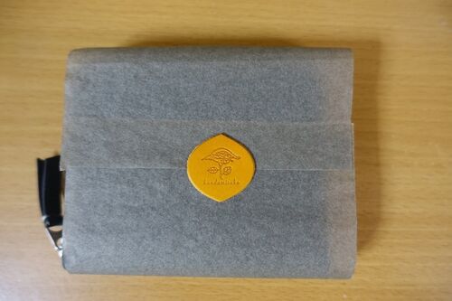 さて、これはなんでしょうか?革っぽいですが… GANZOの紙袋でした。老舗の革鞄ブランドらしさを出しつつ遊び心があります。 で、取り出すと布袋に包まれた縦長の物体。 リュックでした。 革趣味を始めてから一つも買ったことが無かったリュック。引っ張りに…