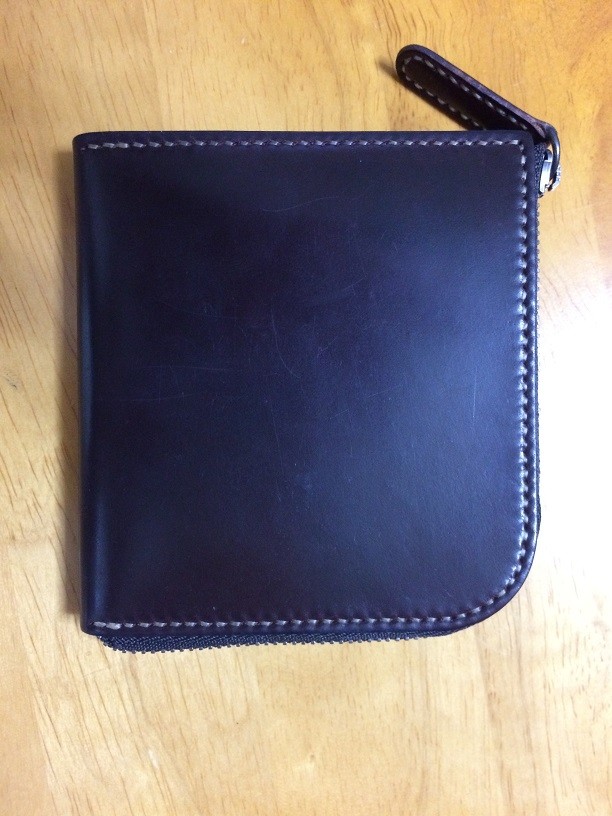 買ったのは、コインケースのPOCKET。形はL字ファスナー。革はホーウィン社のシェルコードバンで総手縫いです。